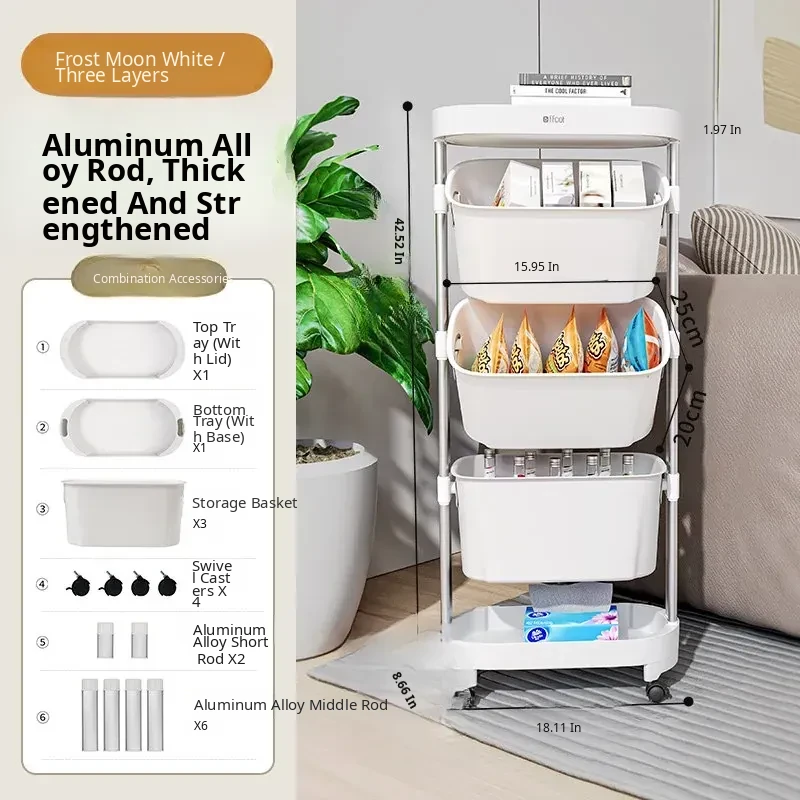 [Frost White-Aluminum Alloy Rod] Three-Layer Trolley Storage Rack (Free Universal Pulleys*4)