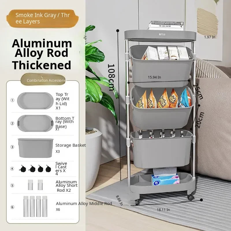 [Smoke Gray-Aluminum Alloy Rod] Three-Layer Trolley Storage Rack (Free Universal Pulleys*4)