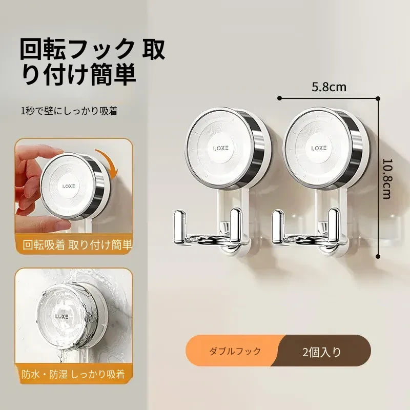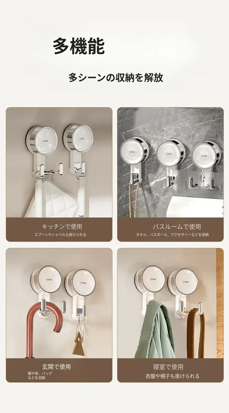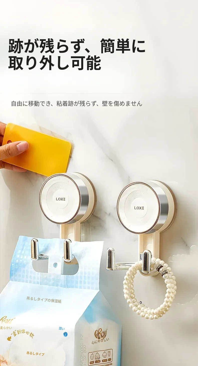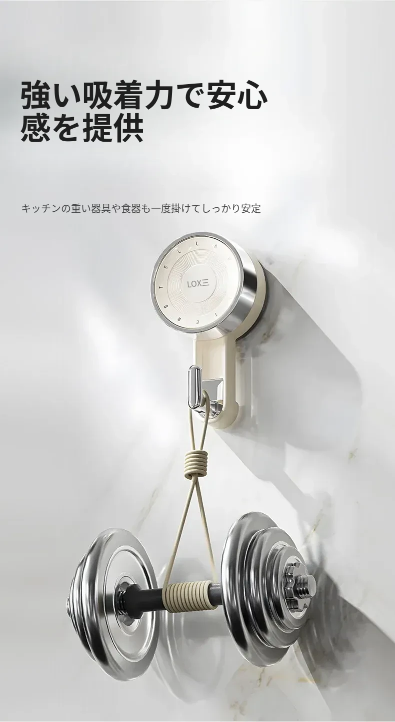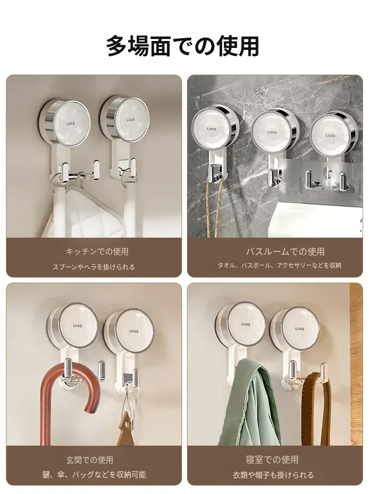 ノーハードルで簡単取り付け!真空吸盤フック - 高い耐荷重で、ドア裏やキッチン、バスルーム、トイレの壁面にピッタリ!跡が残らない粘着式で、すっきりとした空間を実現。