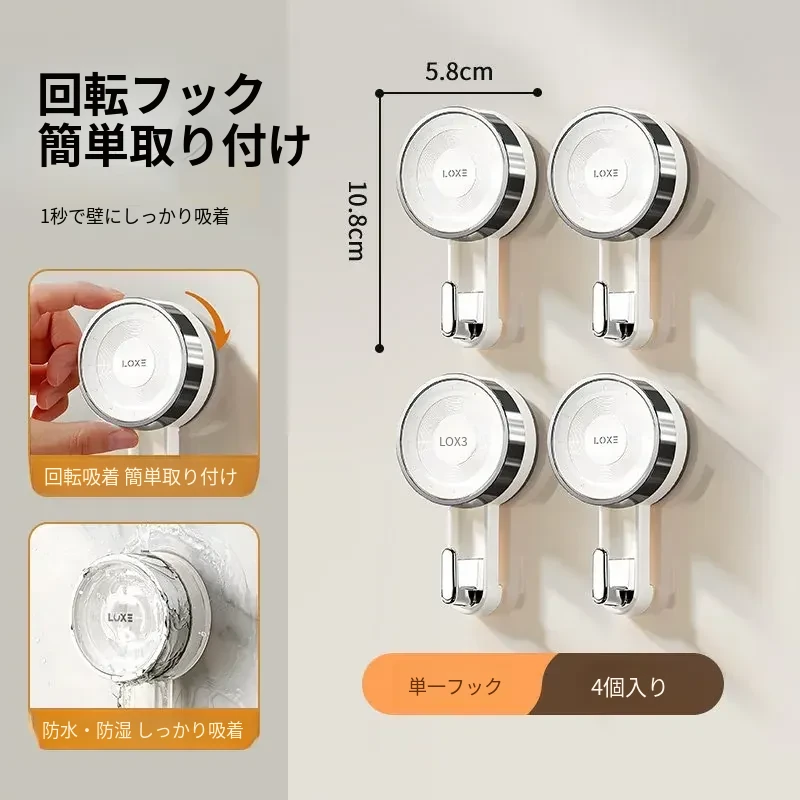【シングルフック-4個セット】真空吸盤/取り外し可能/再利用可能/強い耐荷重