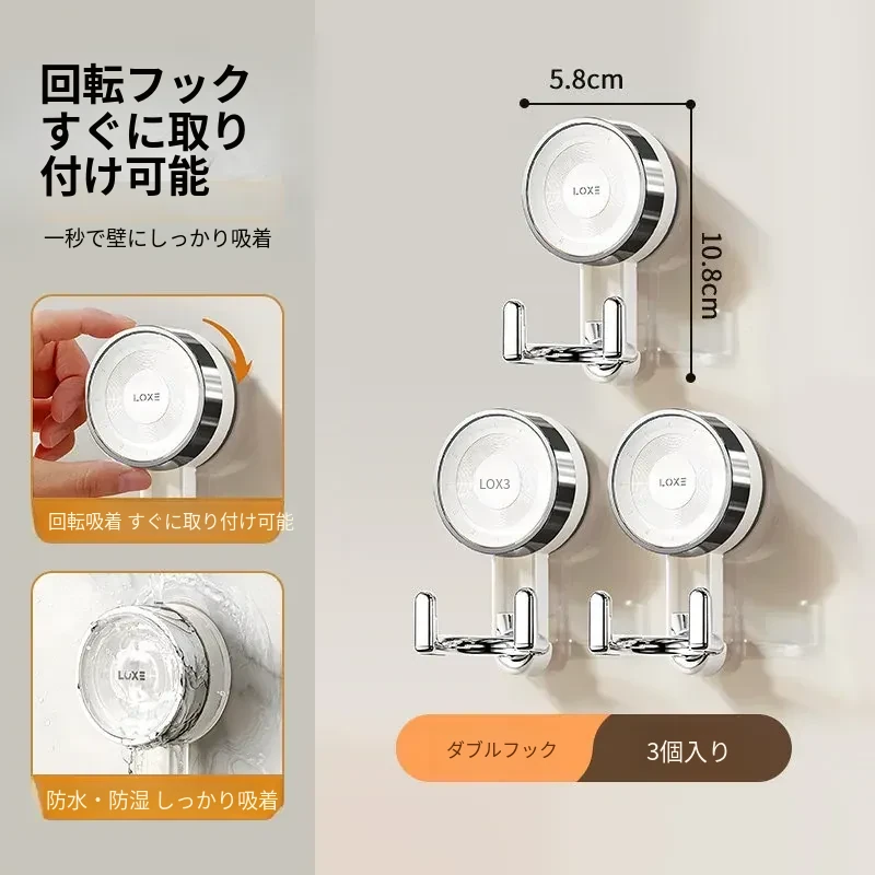 【ダブルフック-3個セット】真空吸盤/取り外し可能/再利用可能/強い耐荷重