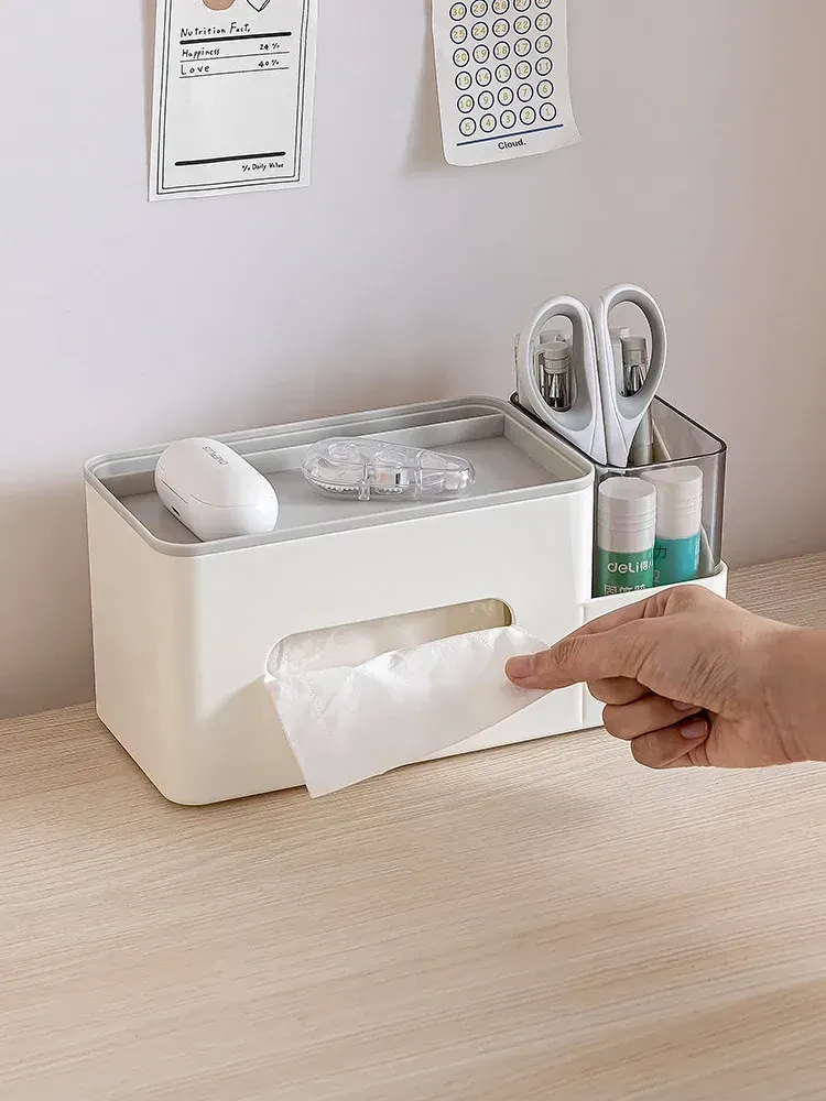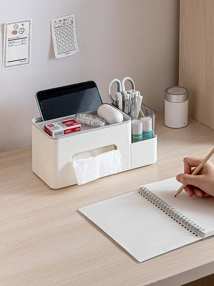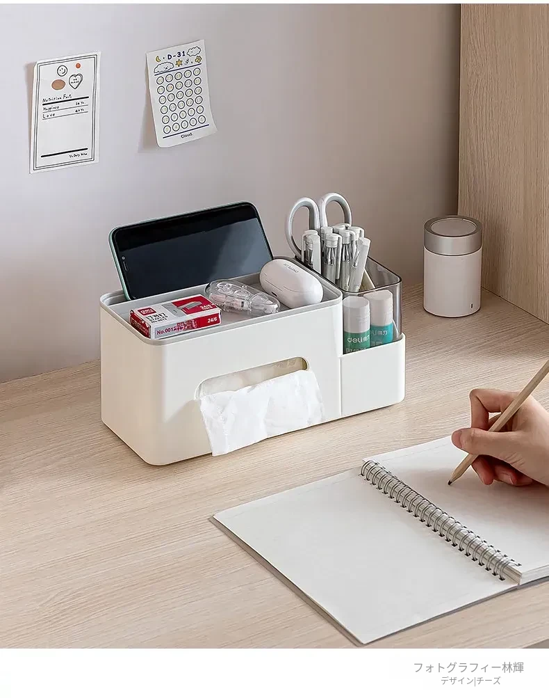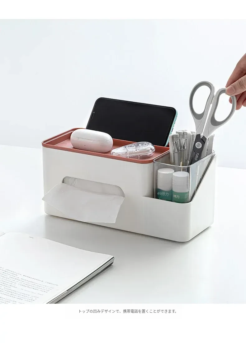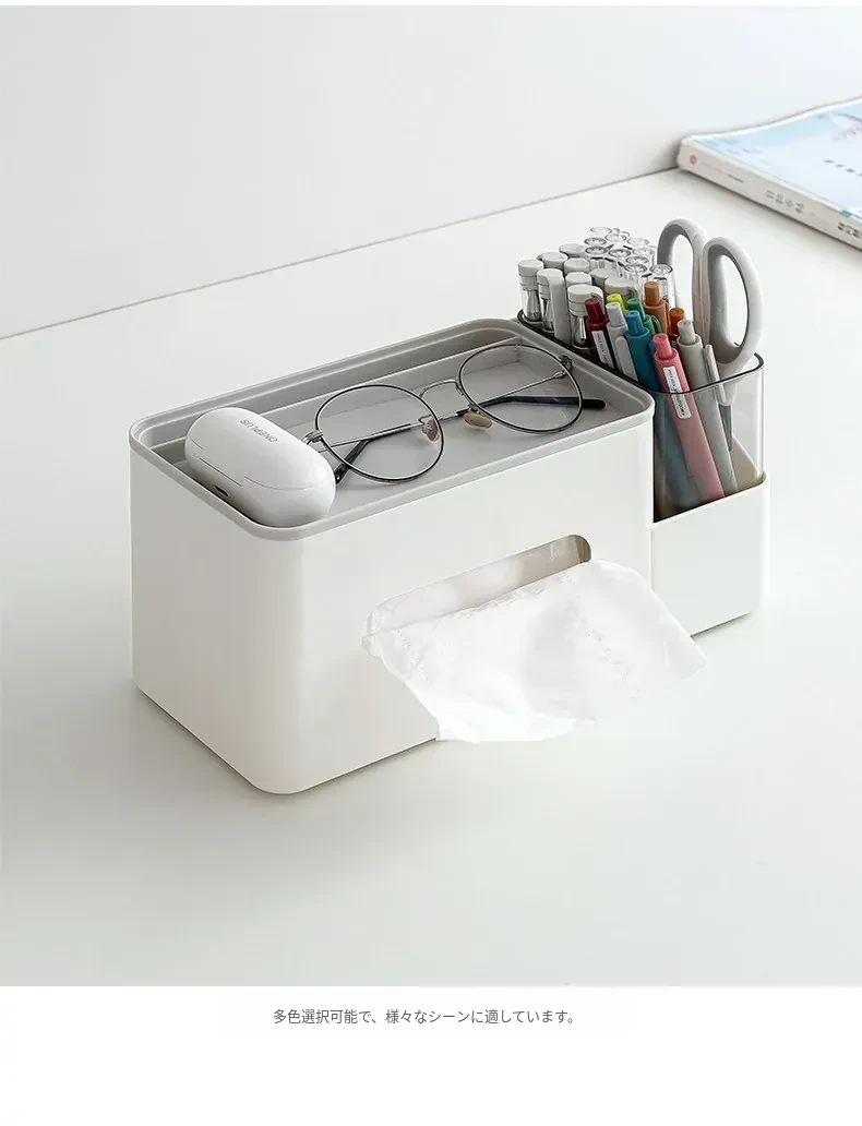 デスク上のティッシュ収納ボックス|学生寮やオフィスに最適な便利アイテム|整理整頓に役立つペン立ても付いて、快適な作業環境を実現!