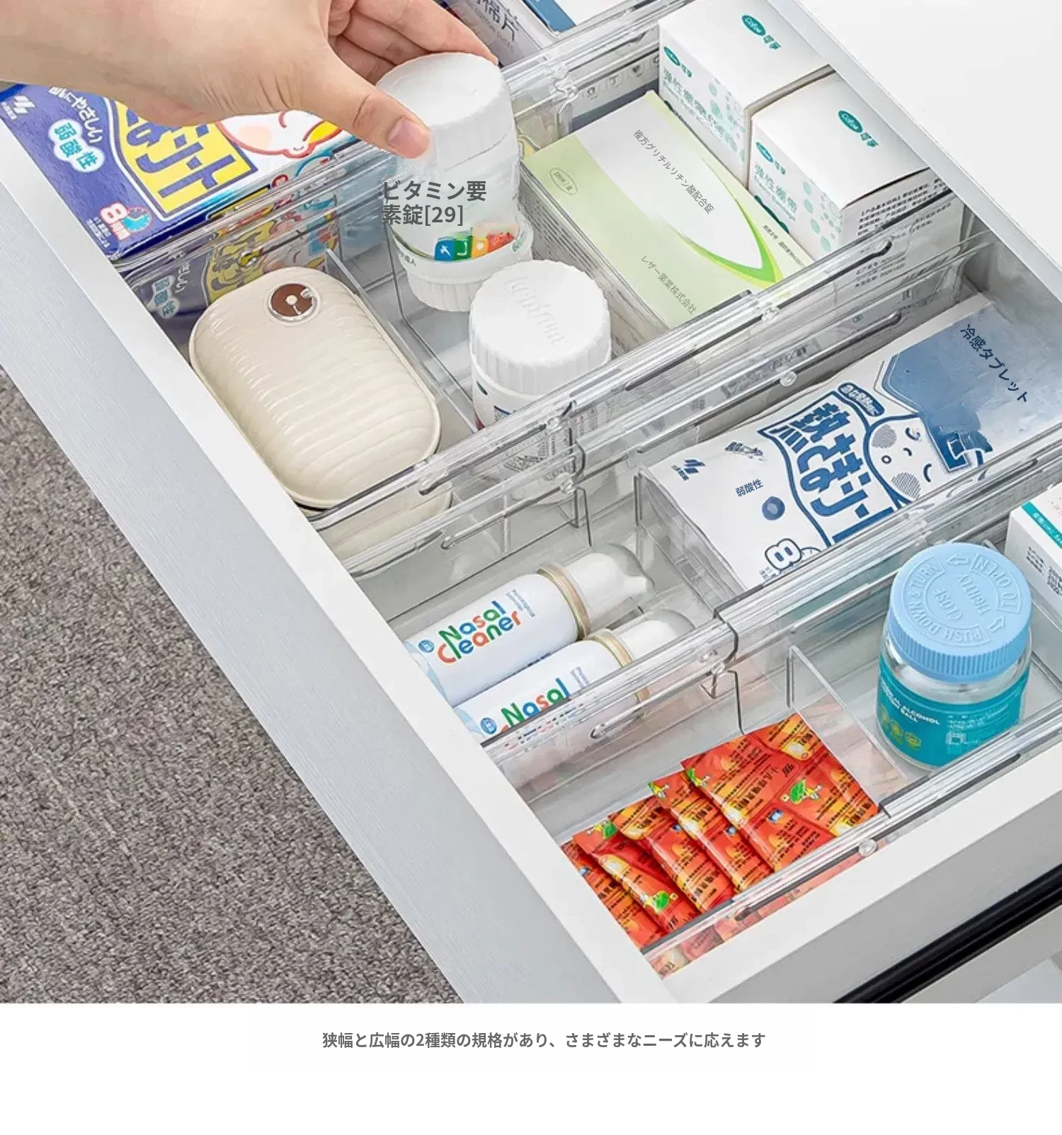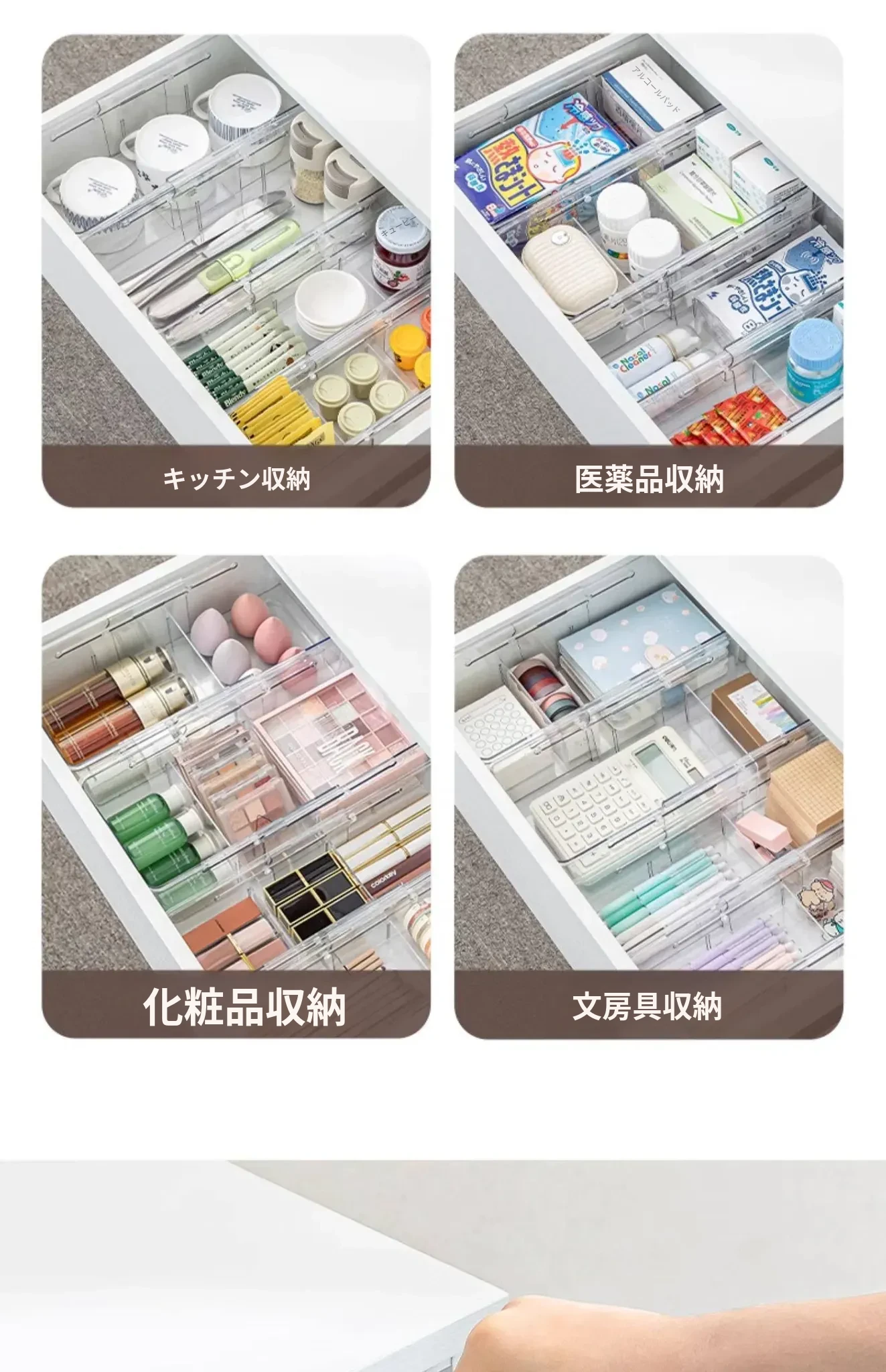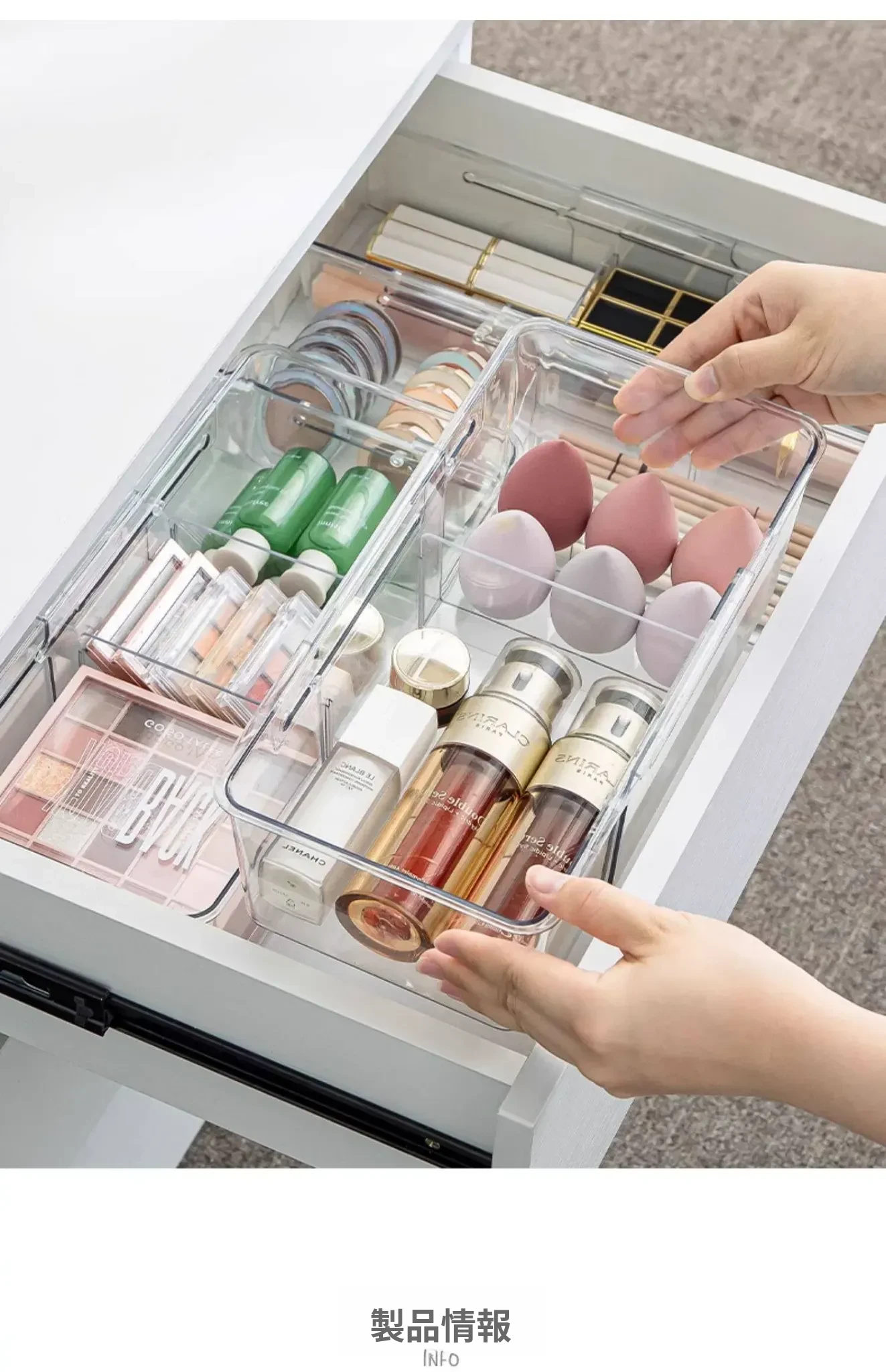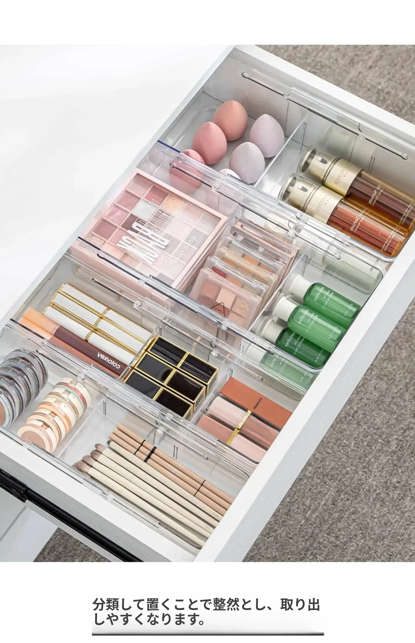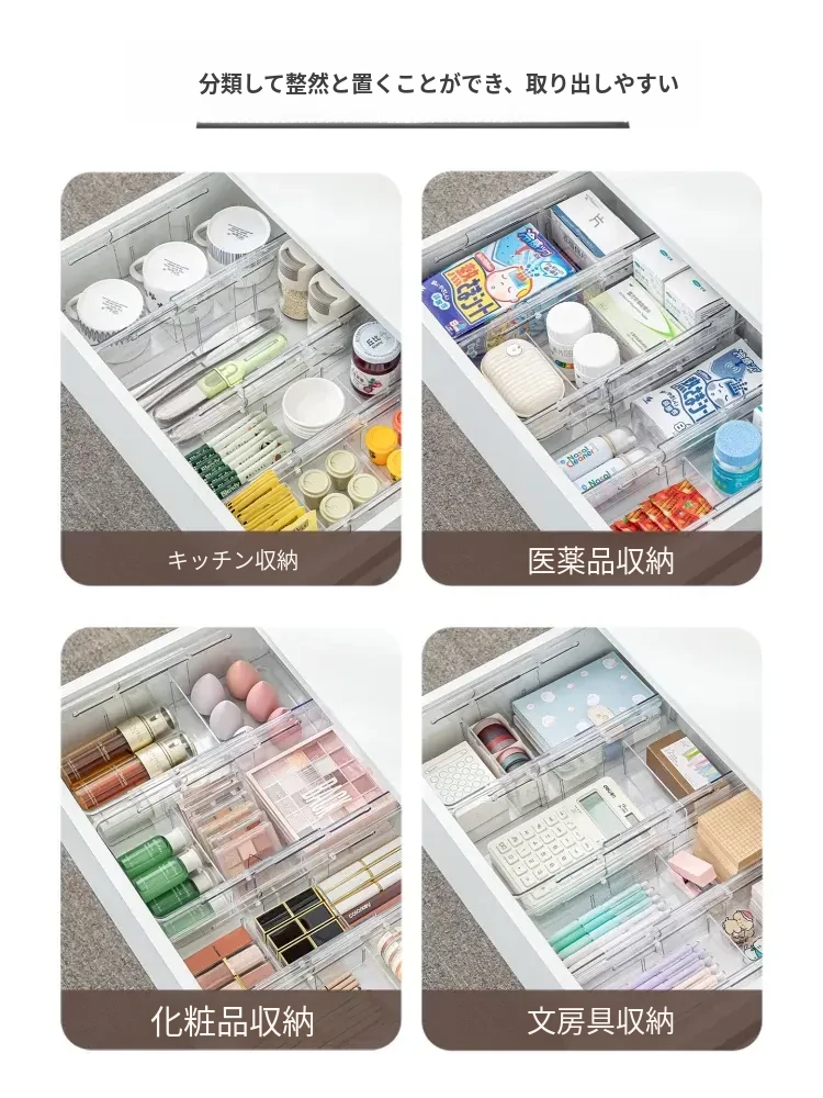 透明で伸縮可能な引き出し収納ボックス - 化粧品や小物をスッキリ整理!内蔵仕切りでキャビネットやデスク周りをすっきり整頓。使いやすさ抜群のオフィスや家庭用に最適!