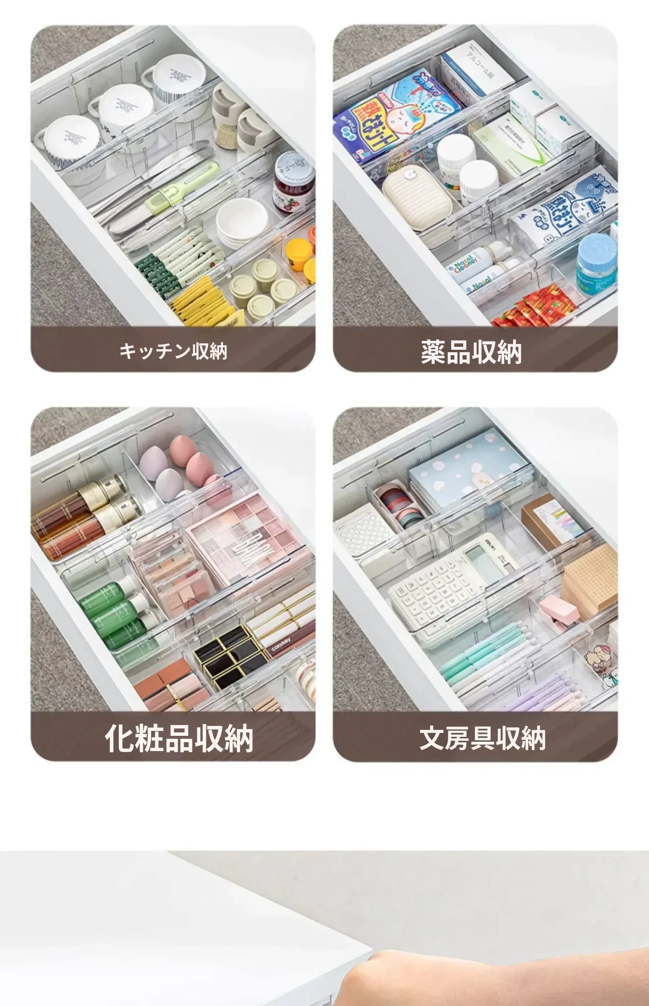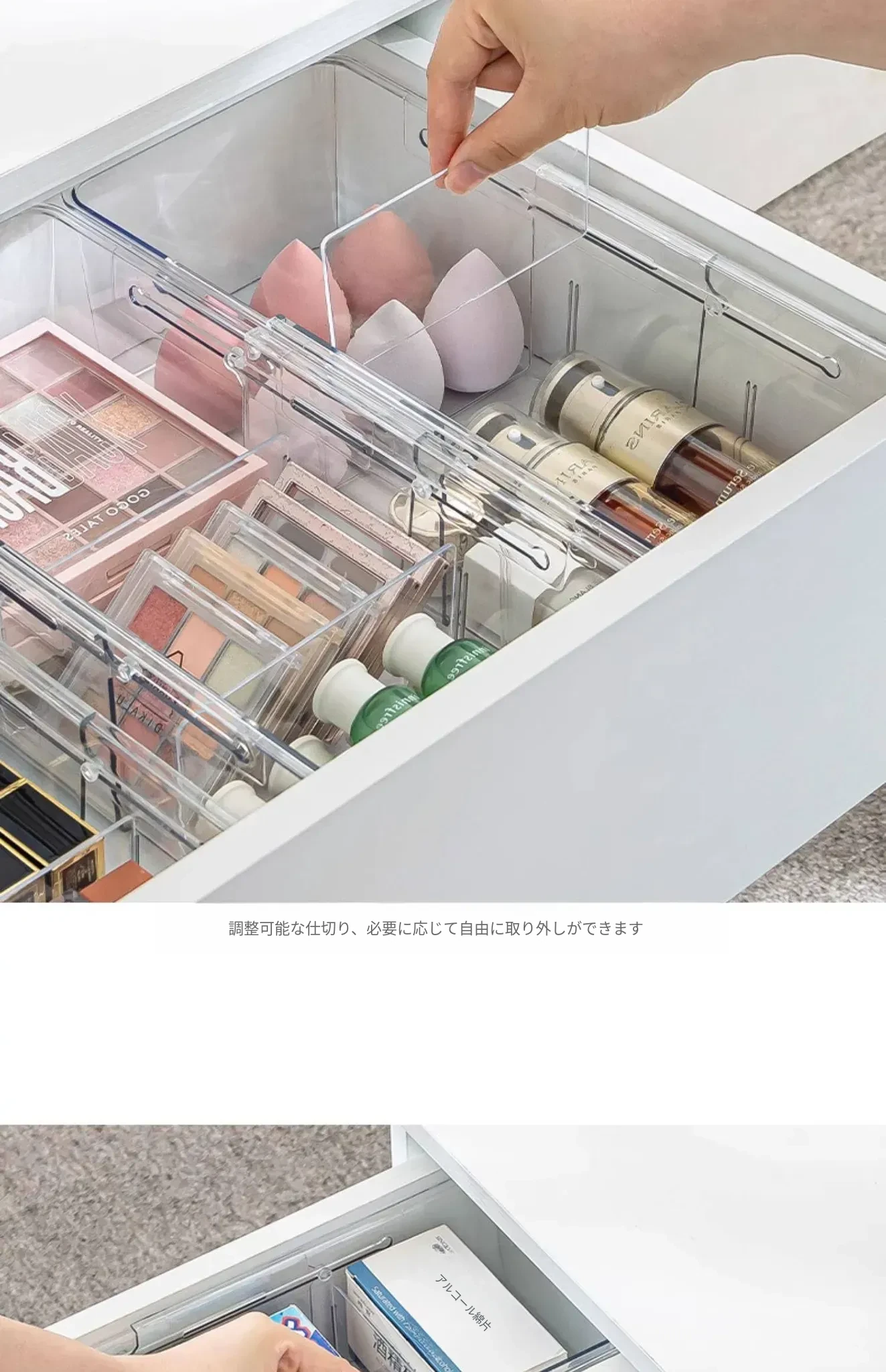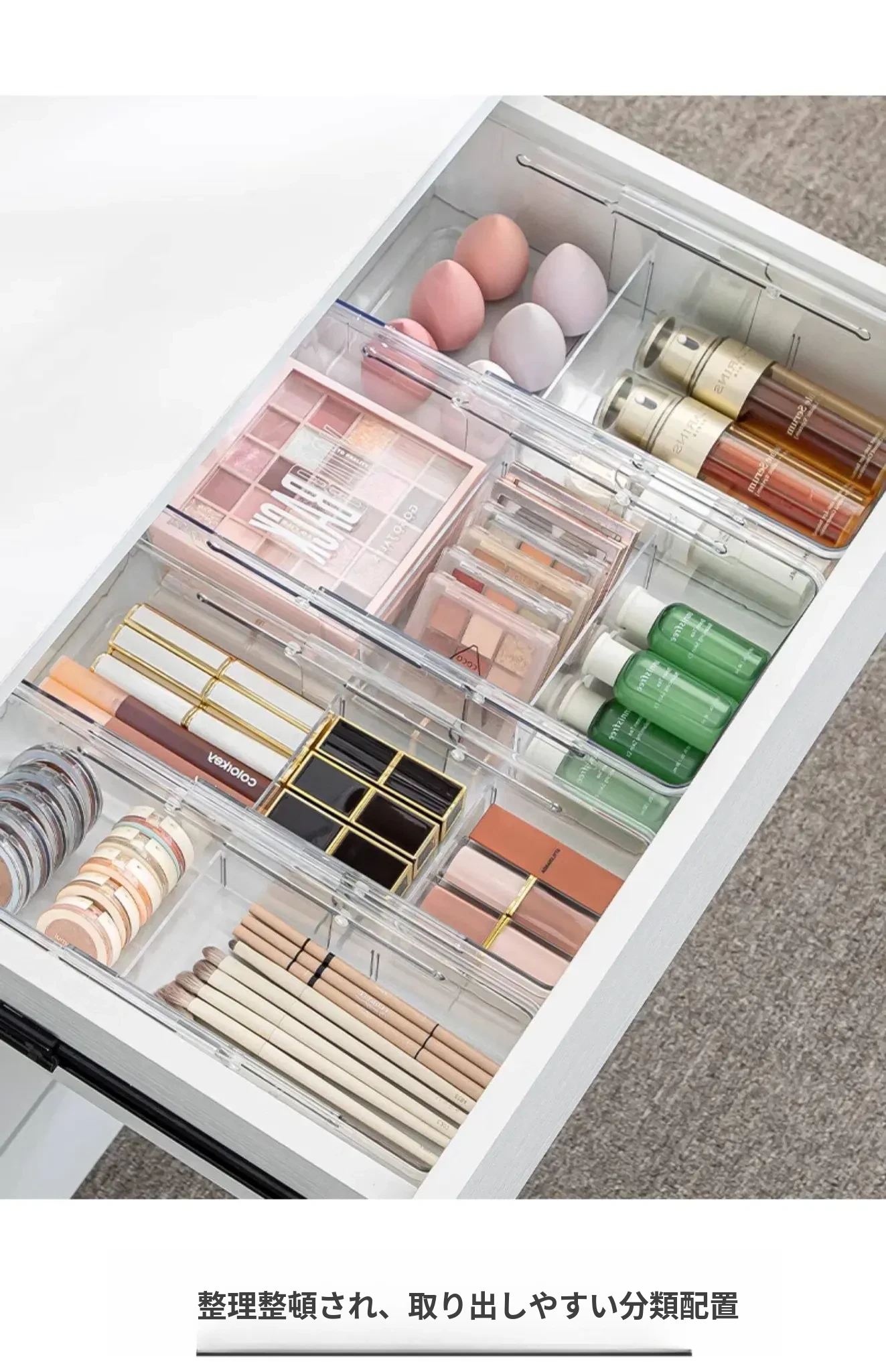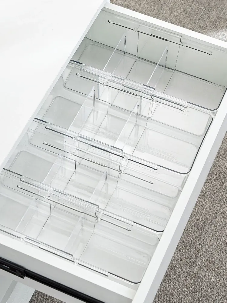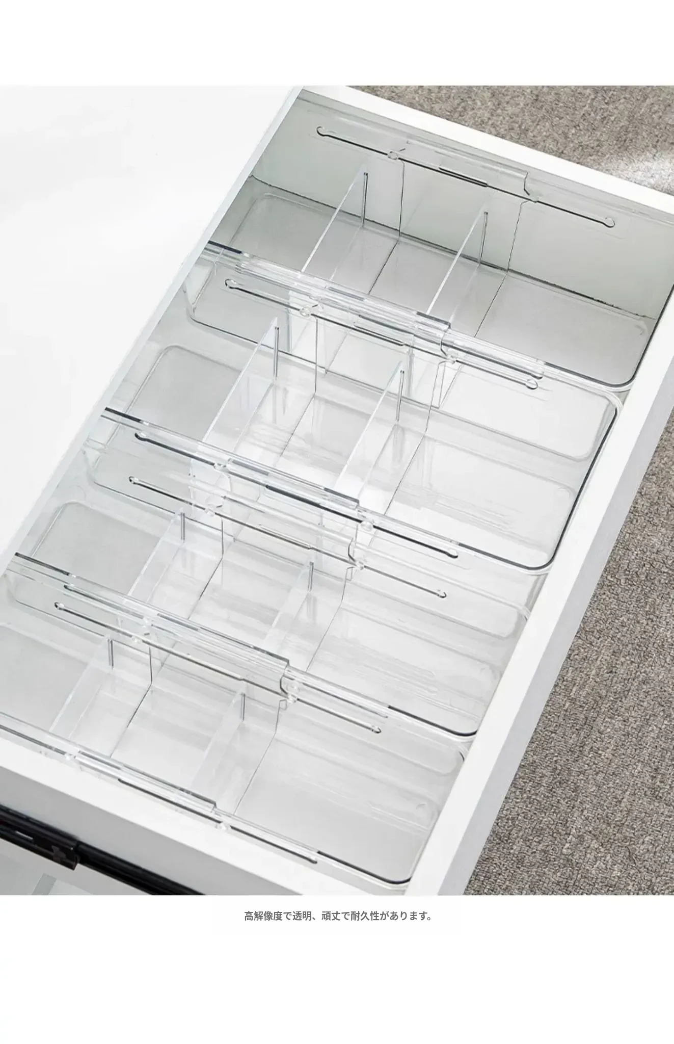 透明で伸縮可能なドロワー収納ボックス - 化粧品や小物を美しく整理!内蔵セパレーターでクローゼットやオフィスもスッキリ。使いやすさと機能性を兼ね備えた理想の収納アイテム!